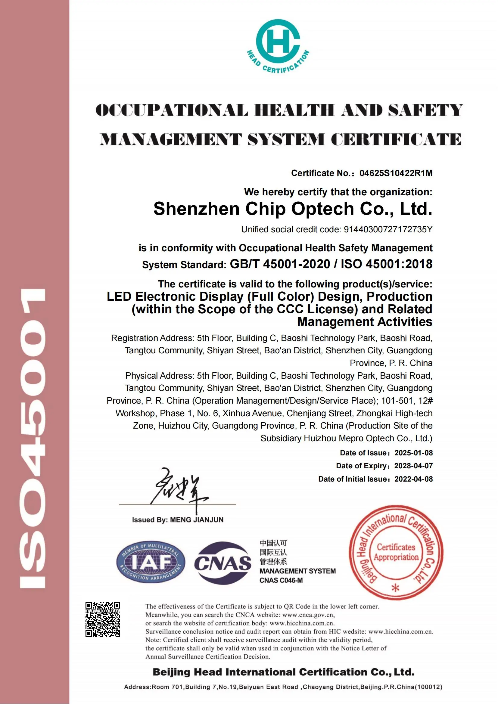 Company certified to ISO 9001:2015, ISO 14001:2015, ISO 45001:2018, and GB/T 29490-2013 (IP management).